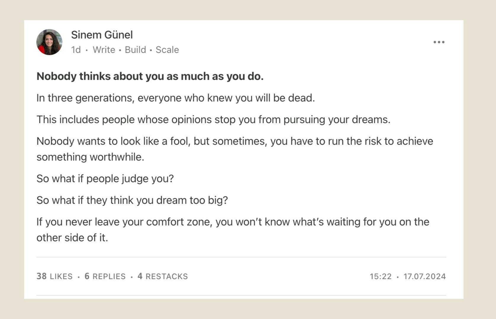 In August, for instance, we'll dive into why we decided to start publishing on Substack and how we'll use it as part of our content marketing strategy in the long run. We'll host several workshops and have a guest interview with a bestselling Substack writer scheduled. This brings me back to making the most out of your summertime: Summer is a great opportunity for you to do your homework and prepare for the next season in your life or career. It's your time to learn, grow, strategize, and test new ideas, so you can execute when summer is over. That's why July was a great time for me to start publishing content on a new platform (Substack). If you're not where you want to be yet, this is a great period to ensure you build momentum for the rest of the year. I don't want you to look back in December and wish that you had done more or achieved more. I want you to make use of your time right now, so you can look back and be proud of how far you've come. If your 2024 goals included boosting (or starting) your digital writing career, reply to this email so we can talk about how we can support you to ensure you spend your summer months well. 👋 Big love from my screen to yours, Here's a subtle reminder to do what you want to do: |